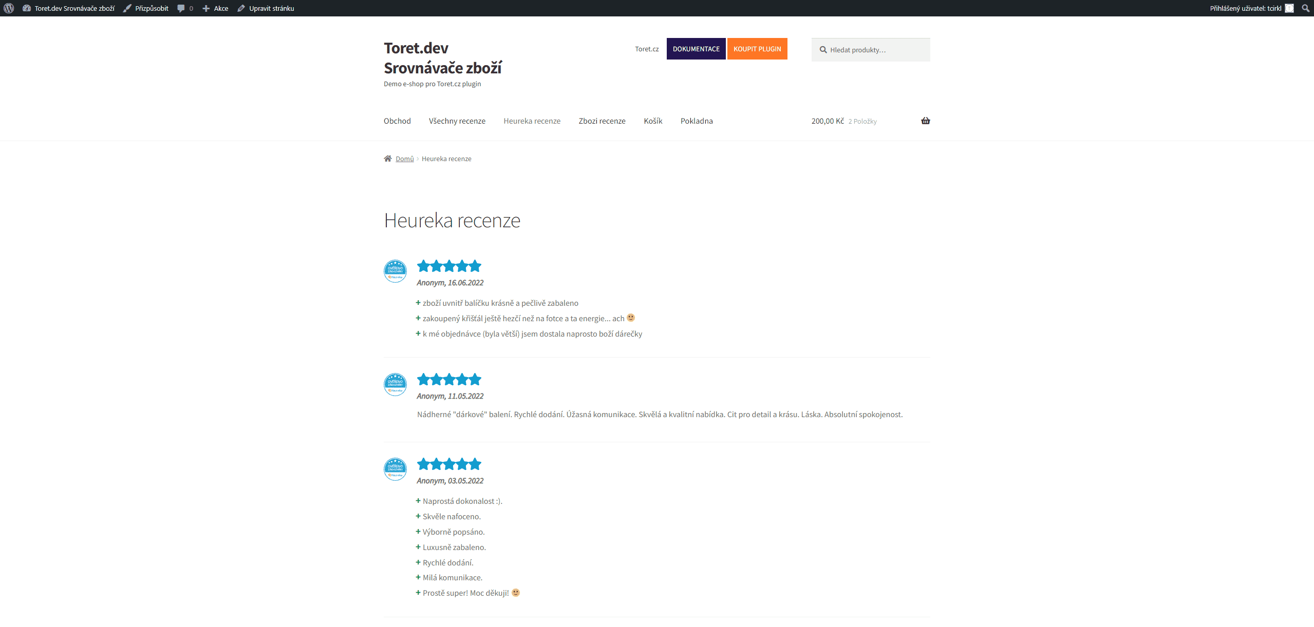 S pluginem můžete na webu zobrazit recenze obchodu za posledních 6 měsíců z porovnávačů zboží Heuréka.cz, Heuréka.sk i Zboží.cz. Recenze můžete aktualizovat ručně nebo automaticky.