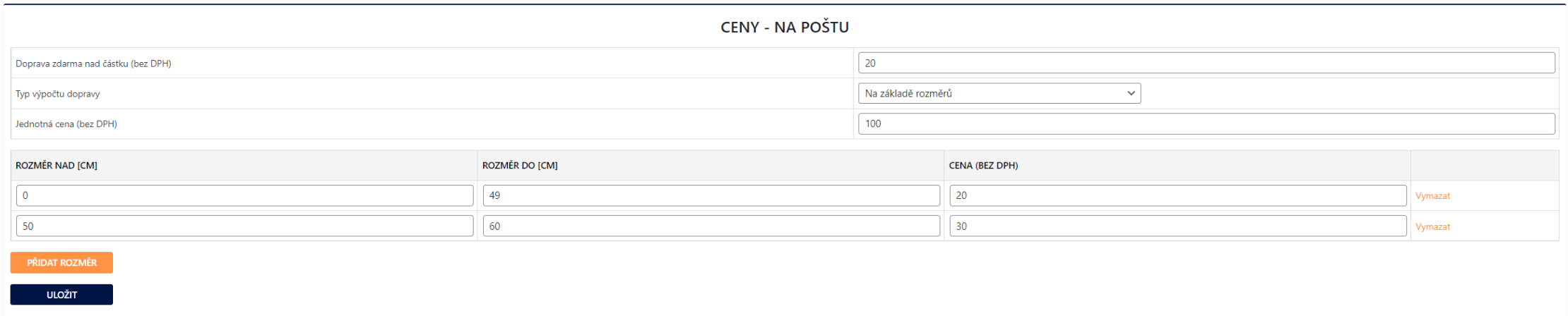 Toret Česká pošta - Nastavení ceny dle rozměrů