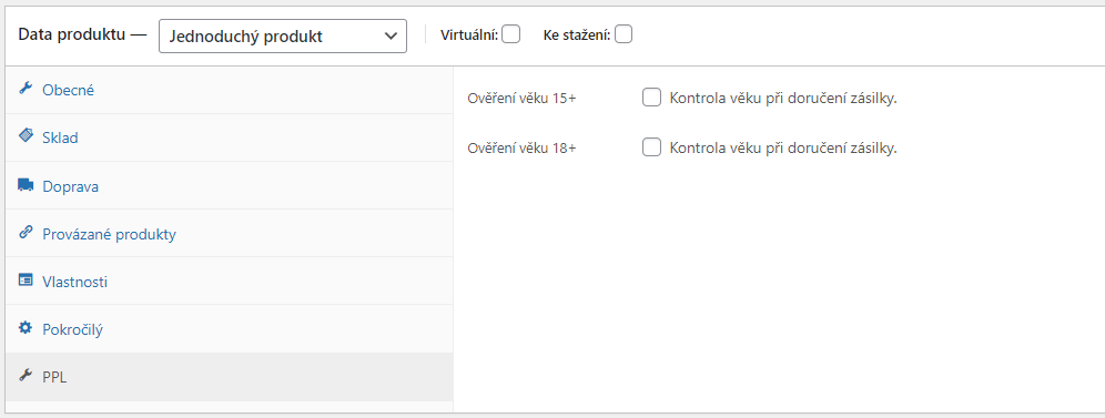 U produktu si nově můžete zaškrtnout ověření věku. Kontrola věku může být nastavena pro 15+ nebo 18+. V případě, že doručovaný balíček obsahuje produkt s vyžadovanou kontrolou věku, je při předání zákazníkovi ověřen minimální požadovaný věk.