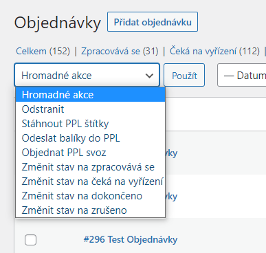 Nově můžete v pluginu hromadně odeslat objednávky do systému PPL. Stejně tak můžete hromadně objednávat svoz pro vybrané objednávky.