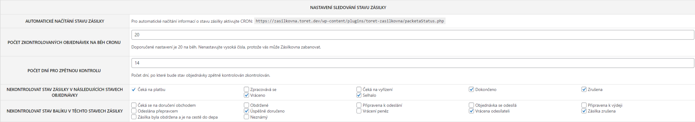 NEKONTROLOVAT STAV BALÍKU V TĚCHTO STAVECH ZÁSILKY – zde můžete definovat, kdy se již dále nebude kontrolovat stav balíku v Zásilkovně. Doporučujeme vybrat Úspěšně doručeno, Vrácena odesílateli a Zásilka zrušena.