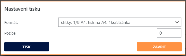 Při jednoduchém i hromadném tisku štítku si nově můžete vybrat formát tisku štítku a pozici, na kterou se první štítek umístí.