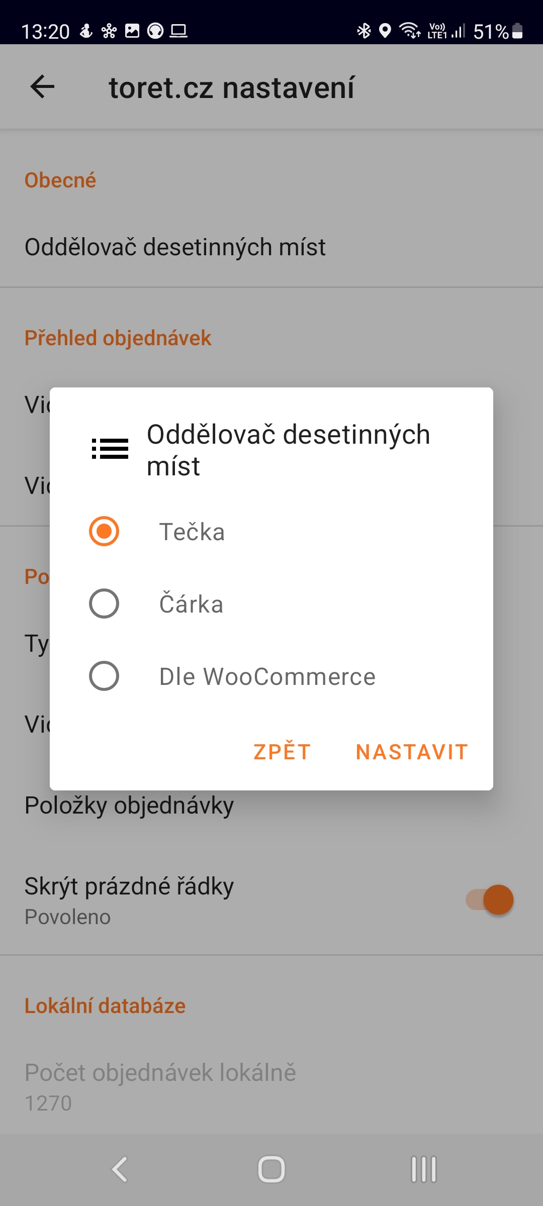 V Nastavení obchodu a položce Oddělovač desetinných míst si můžete nastavit preferovaný symbol. Na výběr máte desetinnou tečku, čárku nebo automatické použití dle nastavení WooCoommerce obchodu.