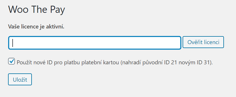 Nové nastavení najdete v sekci Toret plugins → Woo The Pay. Jedná se o zaškrtávací možnost: Použít nové ID pro platbu platební kartou (nahradí původní ID 21 novým ID 31).