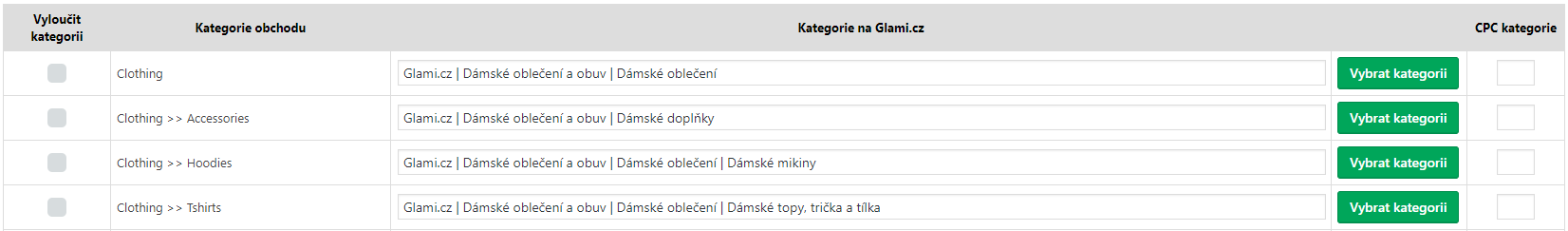 Pro nově vytvořený XML feed je možné nastavit párování kategorií z e-shopu. GLAMI kategorie se do pluginu načítají automaticky a vy je jen musíte přiřadit ke stávajícím kategoriím.