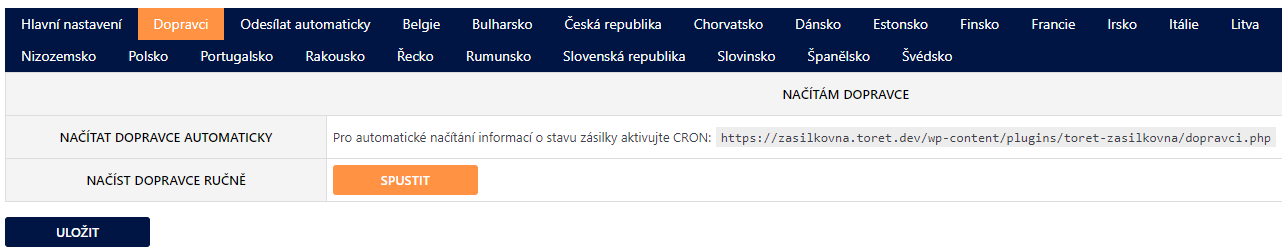 Jestliže automatickou aktualizaci nastavenou nemáte, tak v nastavení pluginu Zásilkovna na kartě Dopravci je možné provést načtení dopravců manuálně pomocí tlačítka Spustit a přenačtení stránky.